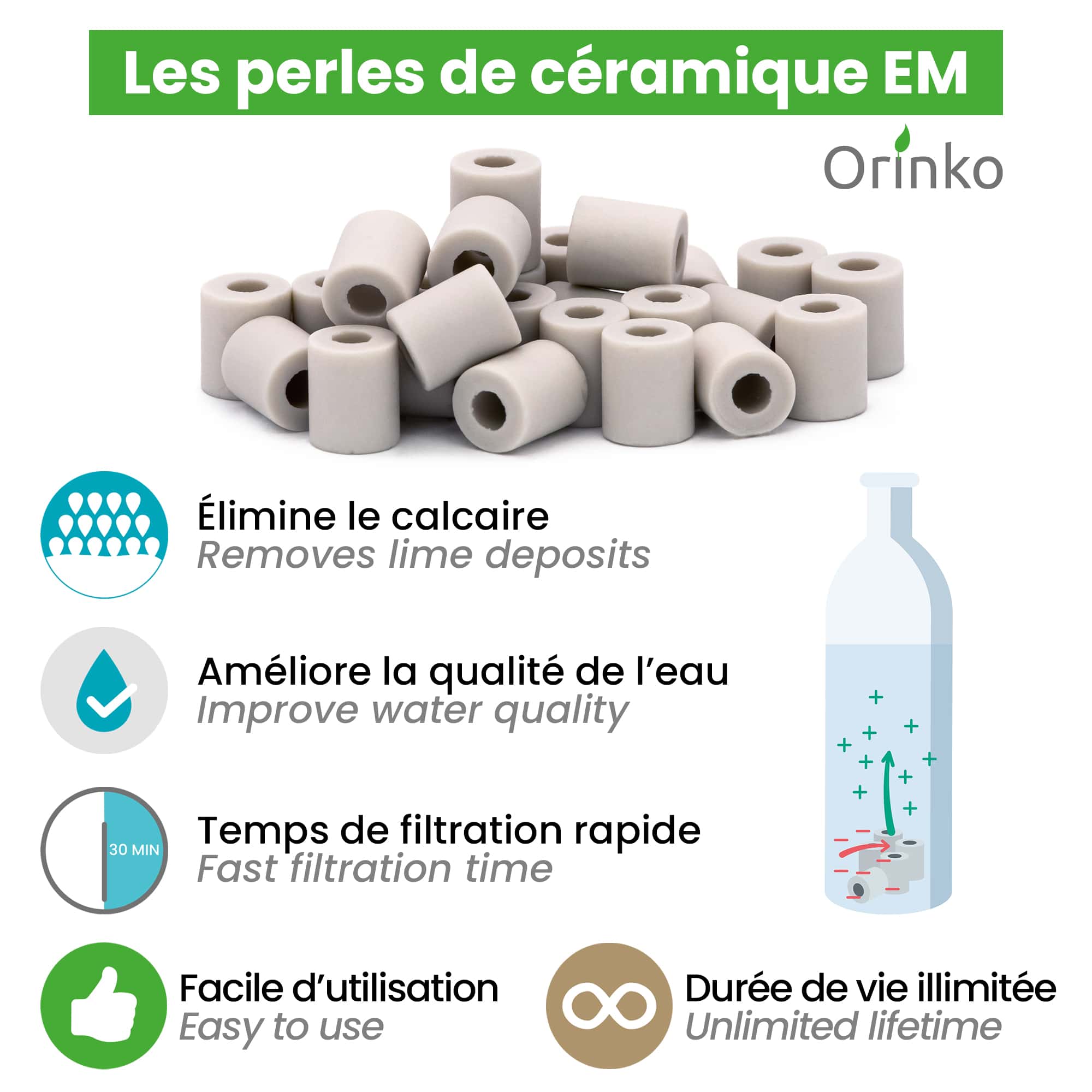 These pearls made from clay and microorganisms modify the structure of calcium crystals and prevent them from depositing in your pitcher, kettle, canteen or carafe. These pearls are not suitable for removing existing calcium deposits from your appliances or containers.