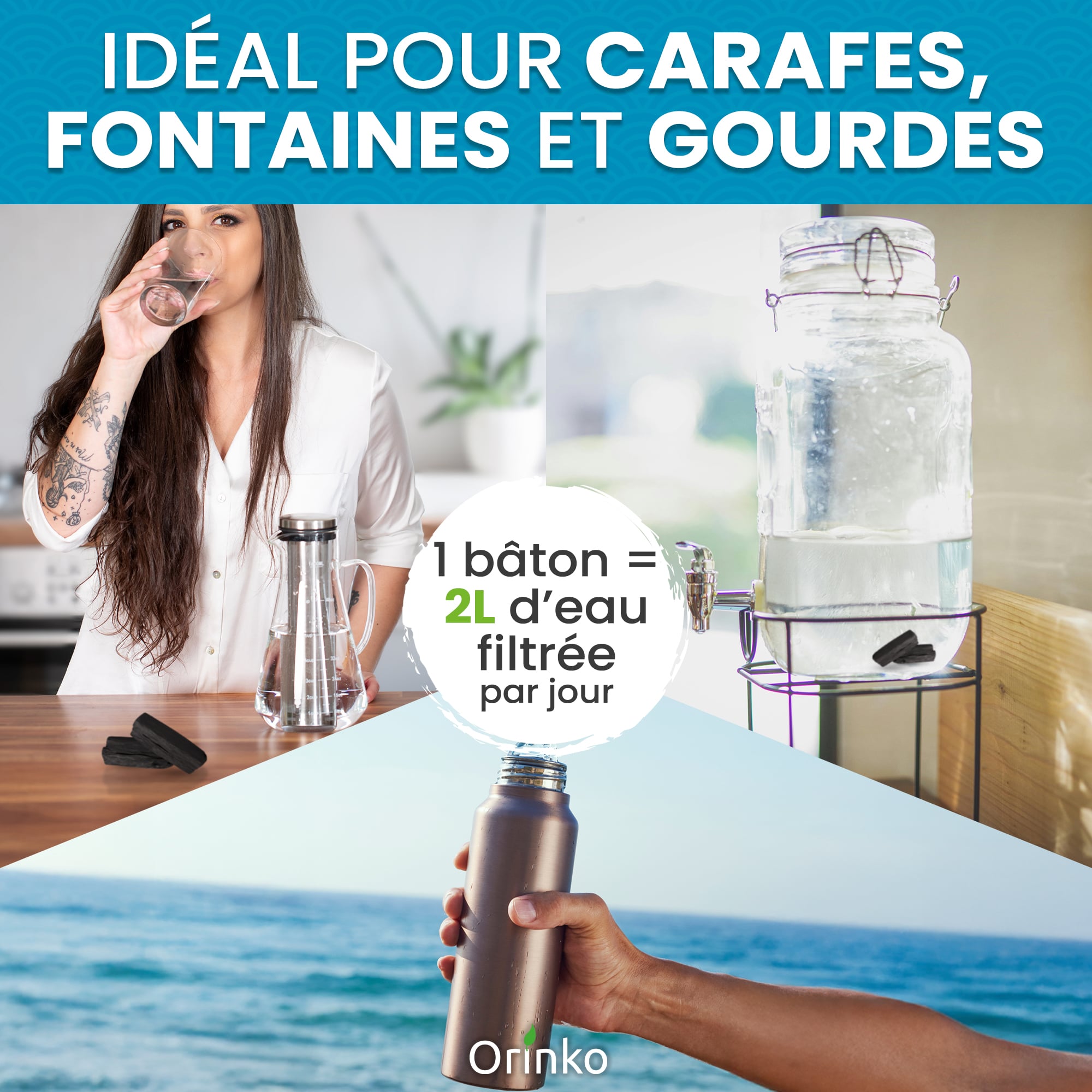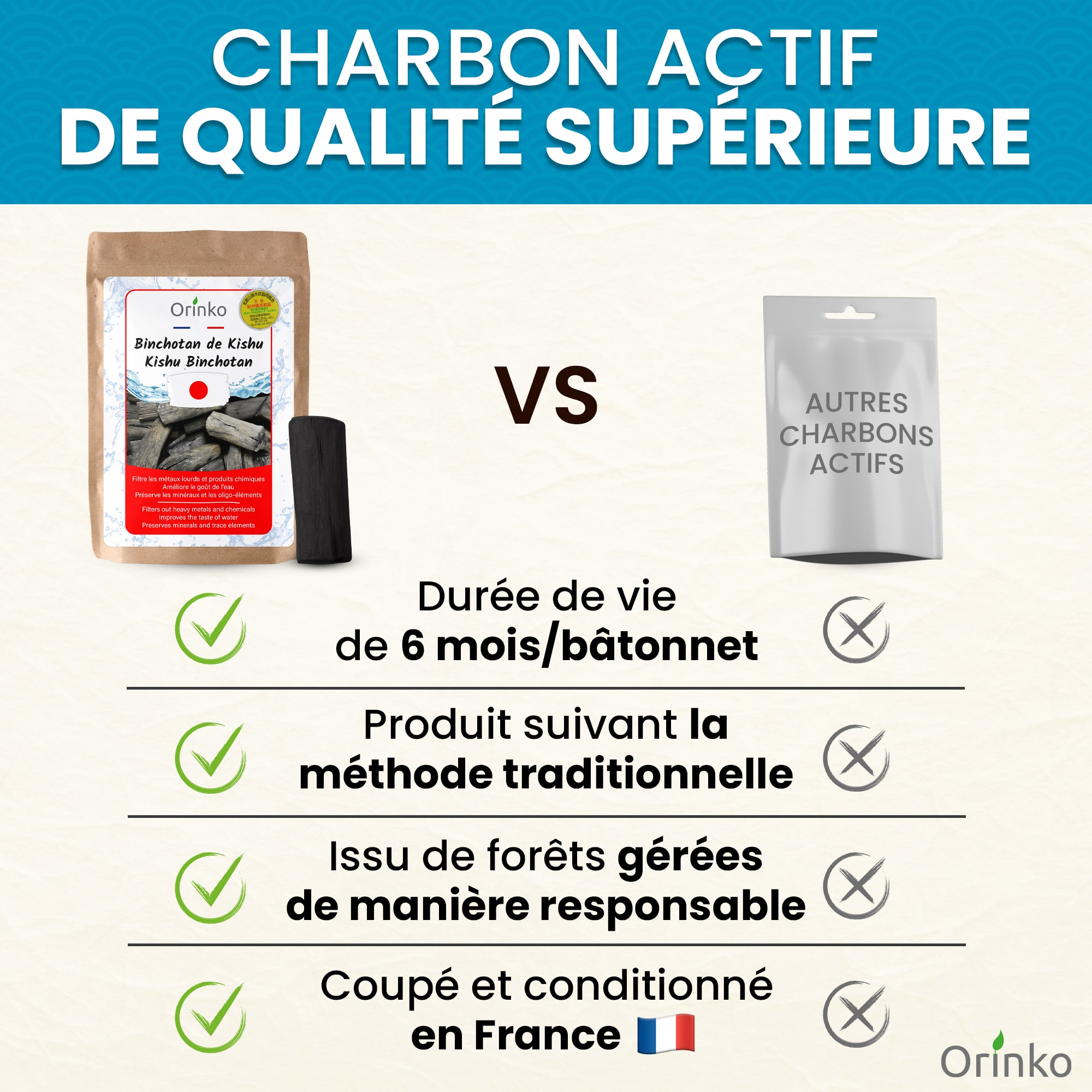 Authentique charbon actif traditionnel du Japon, le Binchotan de Kishu filtre l’eau du robinet en la débarrassant des métaux lourds et des produits chimiques mais relâche les minéraux et les oligo-éléments indispensables à notre organisme. Un bâtonnet de Binchotan filtre l’eau pendant au moins 6 mois à raison de 2 à 3 utilisations par jour. Cela correspond à 540 litres d’eau, soit un budget de 655 € lorsqu’elle est achetée en bouteilles. Les importantes économies réalisées liées à l’utilisation du Binchotan Japonais de Kishu sont une raison supplémentaire pour s’en servir comme purificateur de l’eau du robinet.