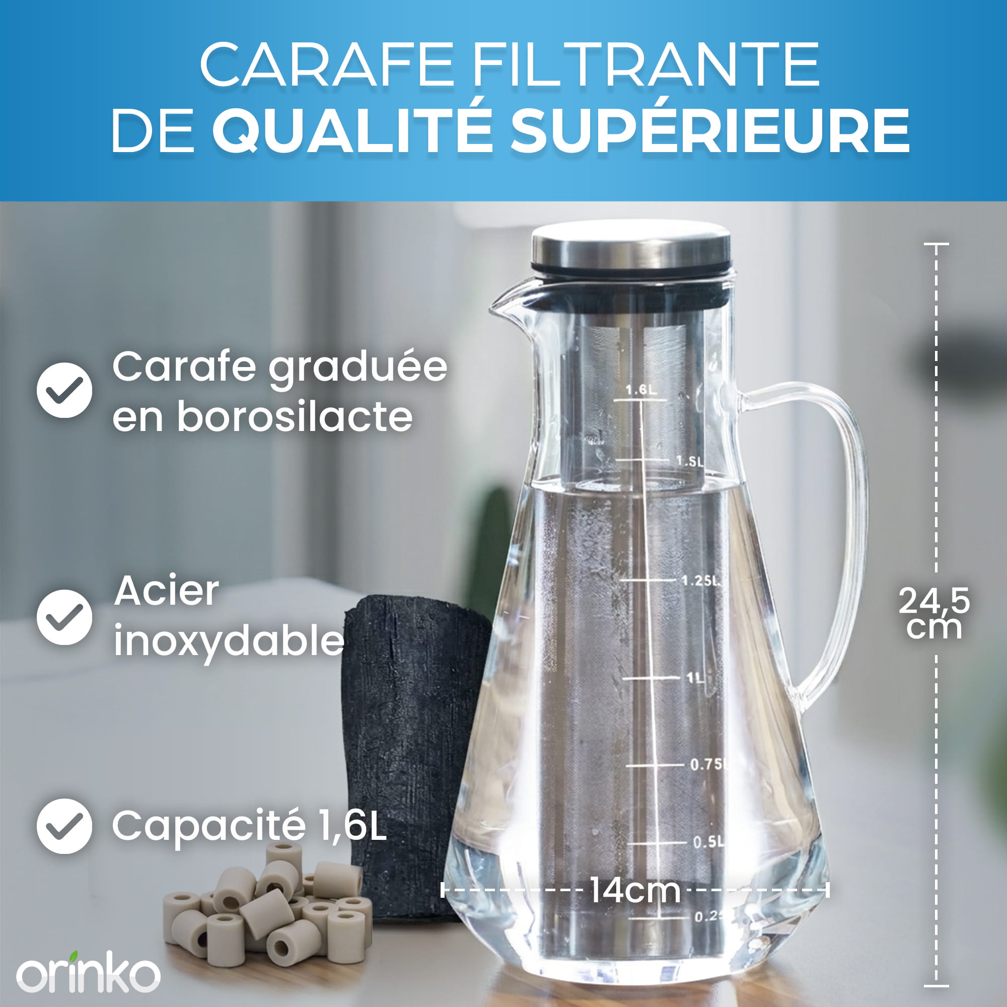 Carafe 1.6L perles de céramique EM + charbon actif Binchotan