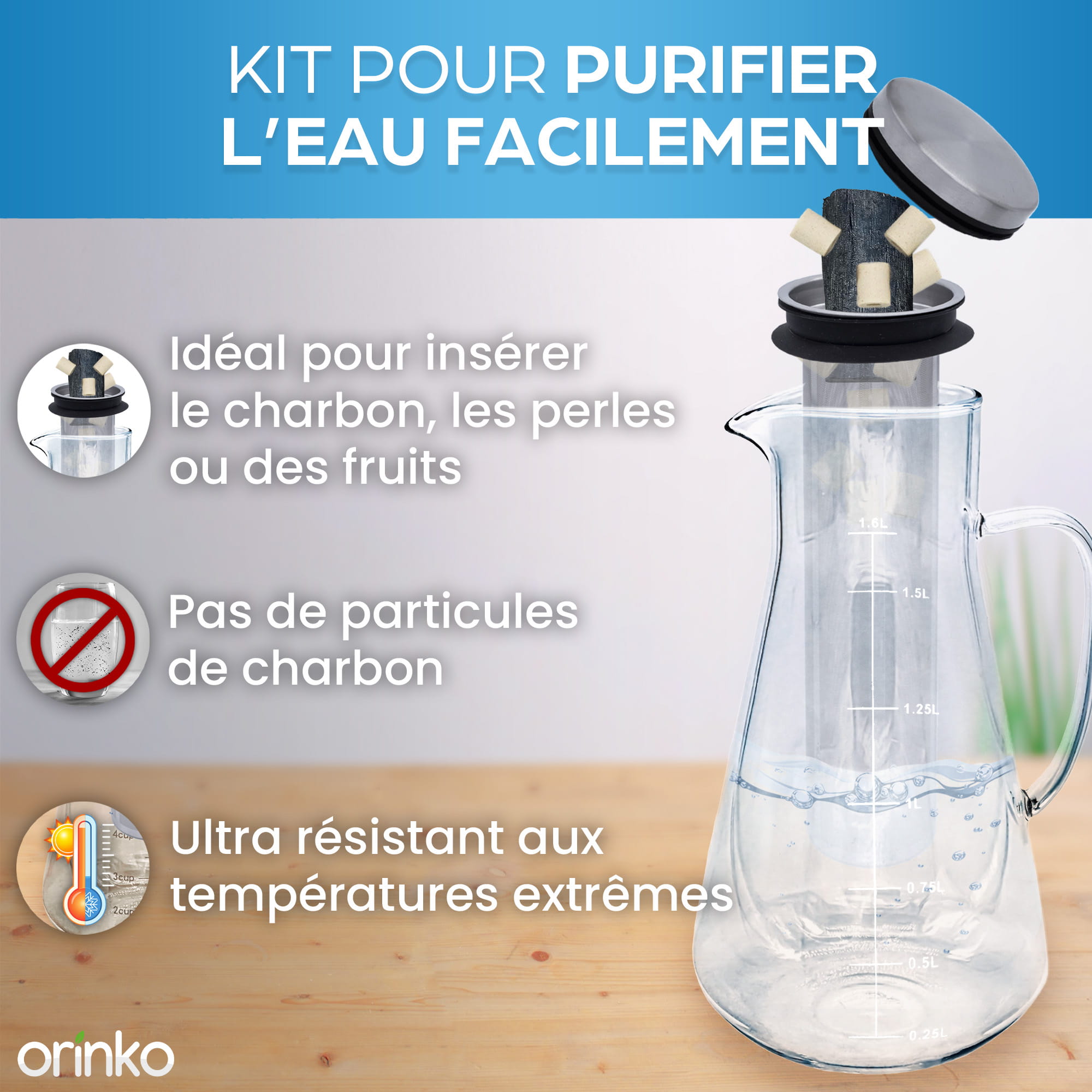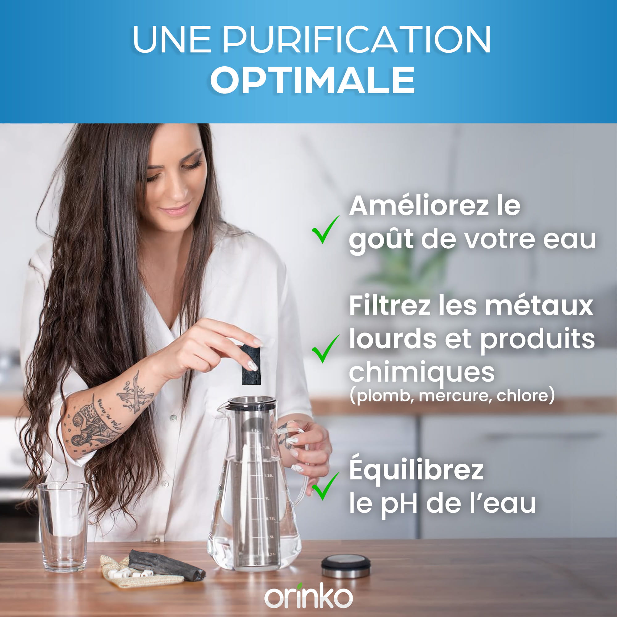 - Grâce au charbon actif Binchotan, votre eau sera quasiment dépourvue de métaux lourds et de produits chimiques