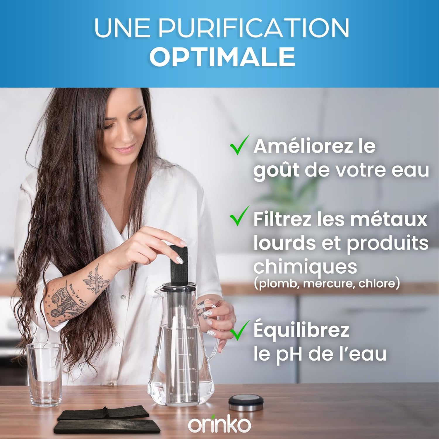 Contrairement aux carafes filtrantes classiques qui éliminent les minéraux essentiels, notre carafe associée au charbon actif takesumi adsorbe les métaux lourds présents dans l’eau du robinet, tout en restituant naturellement des oligo-éléments bénéfiques pour l’organisme.