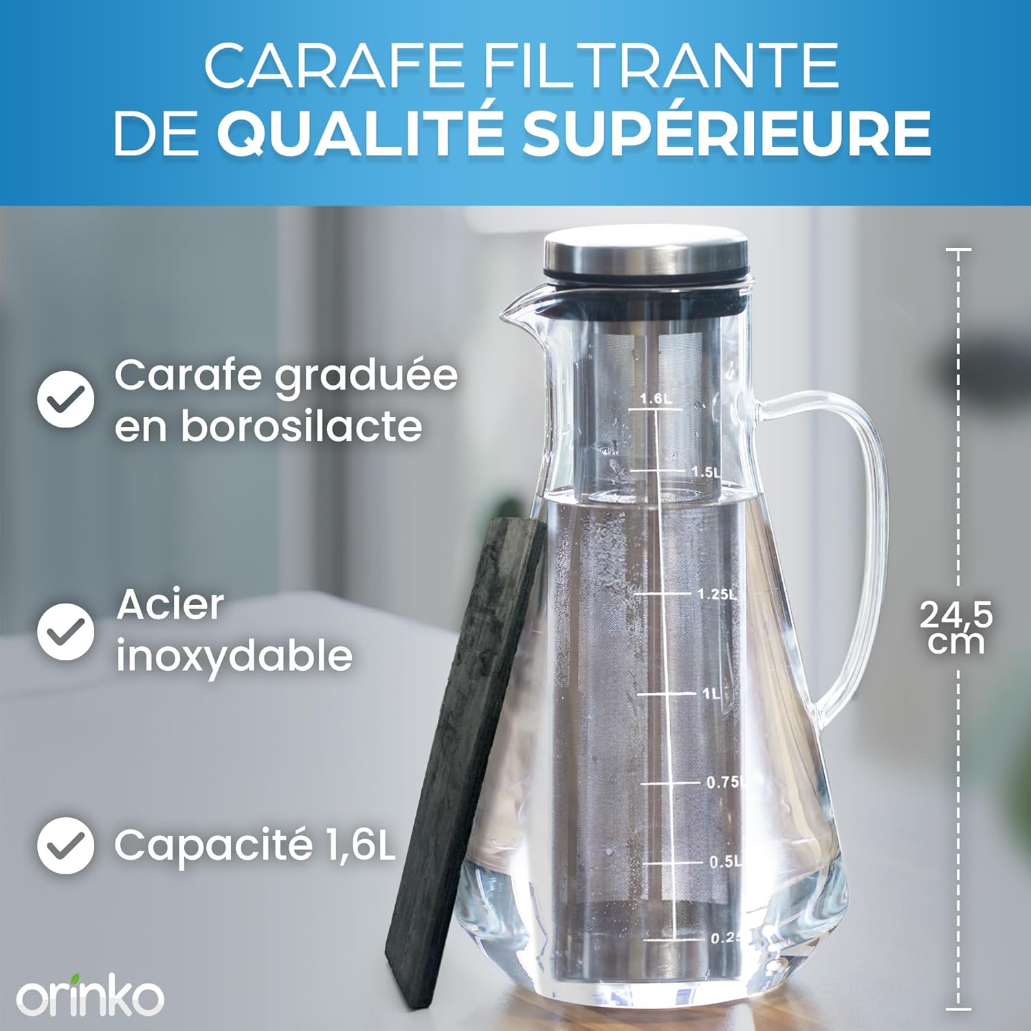 Grâce à son large filtre en acier inoxydable, cette carafe vous permet de :