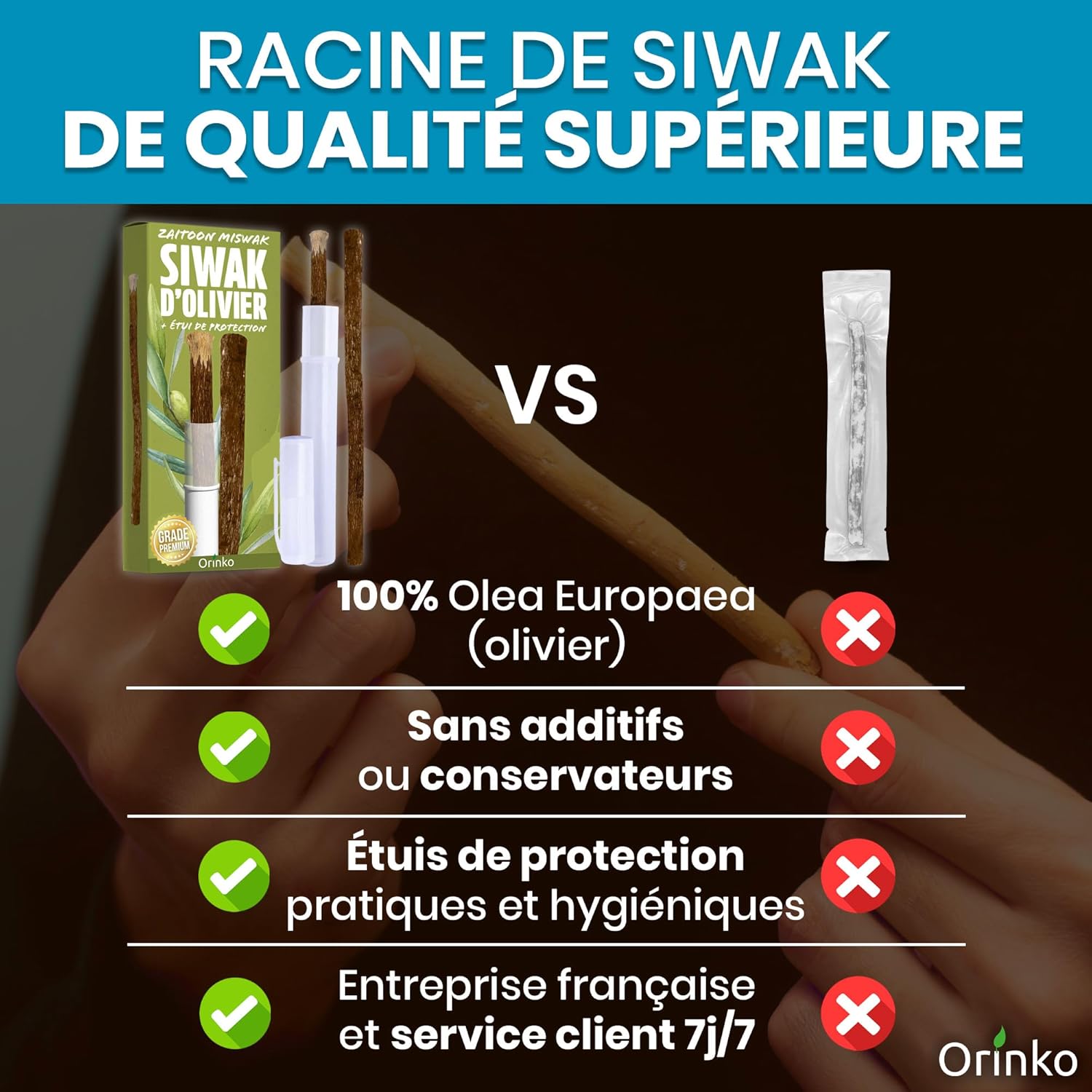 Authentique produit zéro déchet sans additif ni emballage superflu, le siwak d’olivier s’inscrit parfaitement dans la philosophie Orinko : prendre soin de soi avec ce que la nature offre de meilleur.